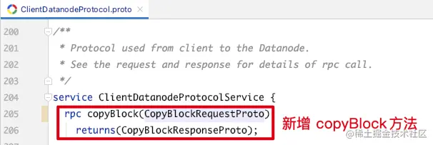 在 ClientDatanodeProtocol 协议里新增加一个 copyBlock 方法