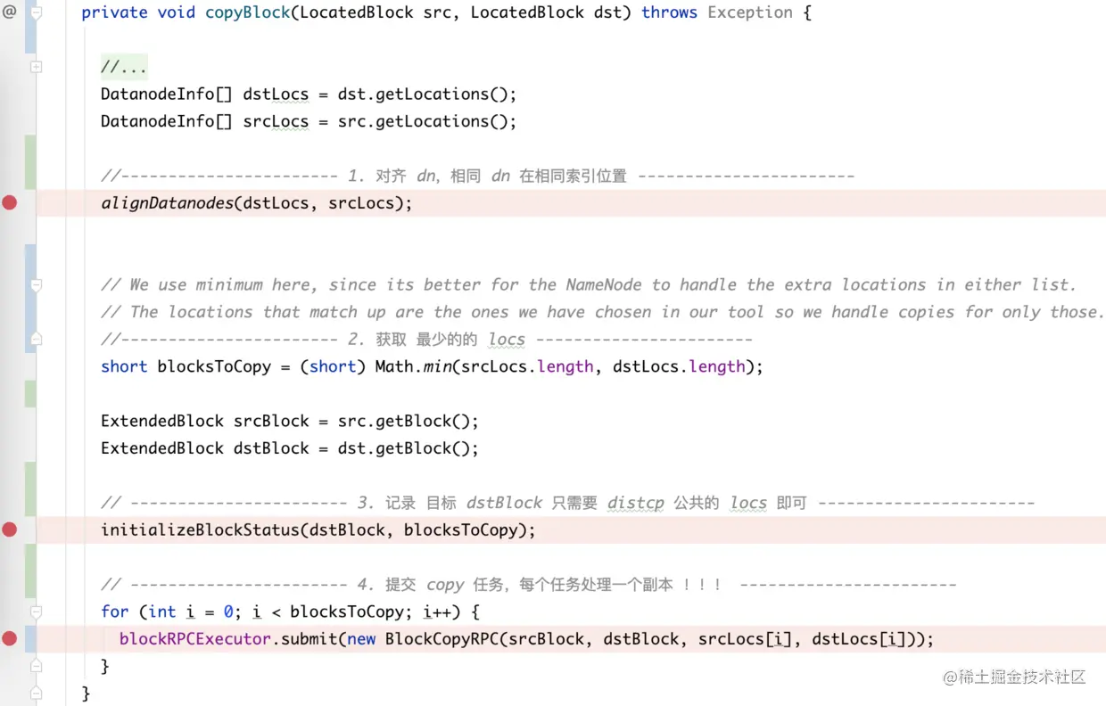 <4> 创建 BlockCopyRPC 提交到线程池执行。线程内部调用 ClientDatanodeProtocol 的 copyBlock 实现 fastcopy。虽然 <3>中 addBlock 传入了 favoredNodes,但是 dstBlk 的副本节点不一定是这批机器,因此,这里先做了一个对齐操作(相同 DN 上进行 LocalBlockCopy,不同的 DN 上走 DataCopy),每个副本对应一个同步线程