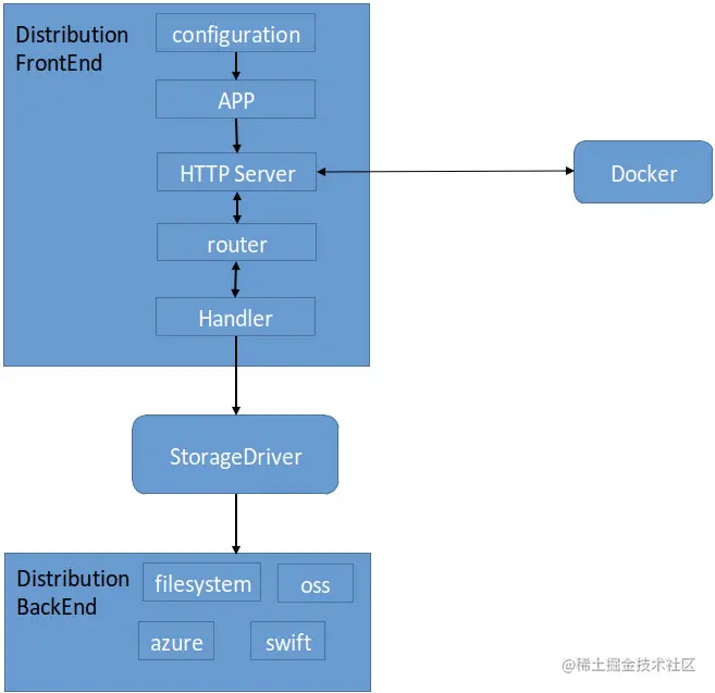 监听docker请求,分配Handler从registry存储后端读取数据,读取时会根据不同的后端调用相应的storagedriver,读取数据之后将数据返回给docker端