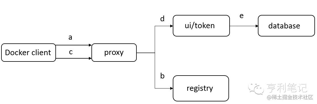 (c) token 服务在经过Nginx转发得到这个请求后,会访问数据库核实当前用户是否有权限对该image进行push。如果有权限,它会把image的信息以及push动作进行编码,并用私钥签名,生成token返回给Docker客户端;