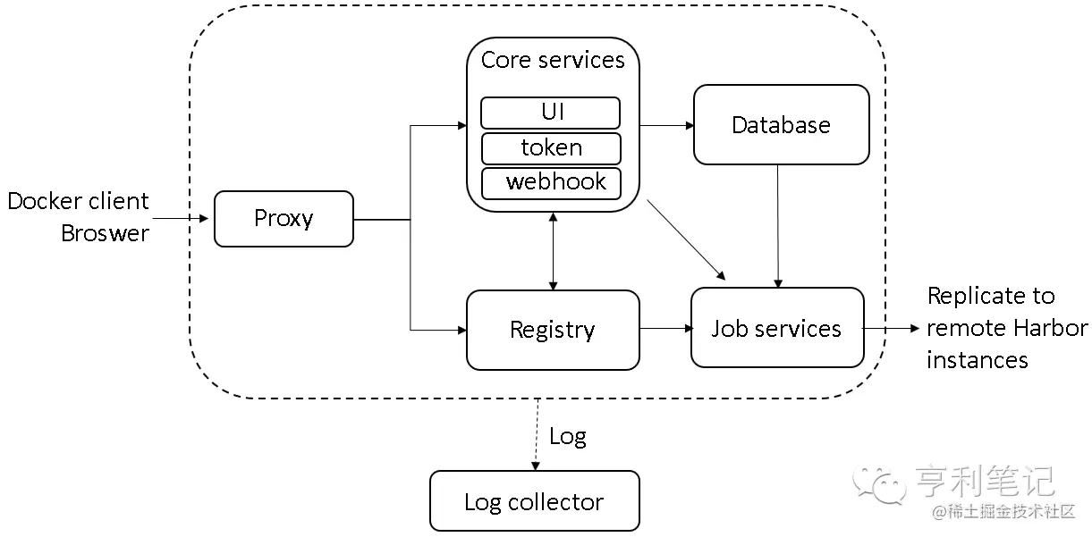 - Proxy:Harbor的registry, UI, token等服务,通过一个前置的反向代理统一接收浏览器、Docker客户端的请求,并将请求转发给后端不同的服务。