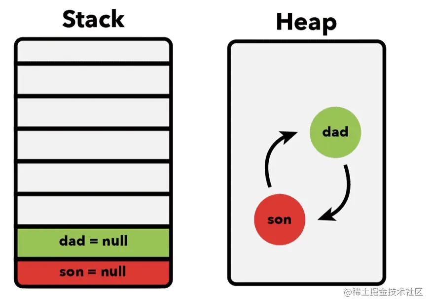 因为 son 和 dad 两个对象相互引用了,所以算法不会释放已分配的内存,但是也无法通过代码访问它们