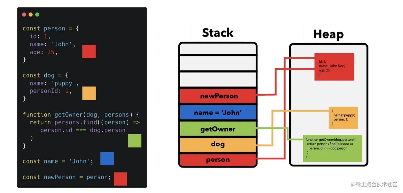 在这张图中可以观察到不同的值是如何储存的,注意 person 和 newPerson 指向同一个对象