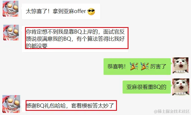 看重BQ倒也不是坏事,BQ比重大也意味着它可以成为面试利器,此前就有人算法水平勉强过关,但靠着BQ成功PK掉对手!