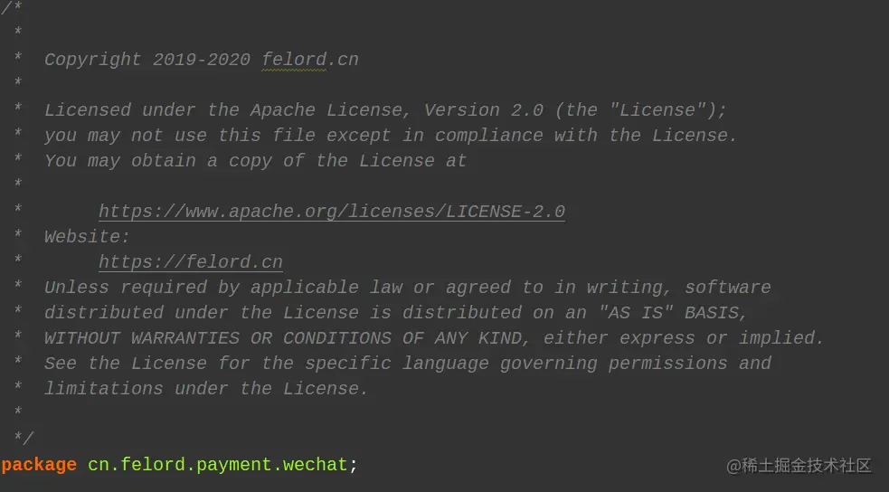 协议除了放一个LICENSE文件在项目的目录中外,最好在每一个源代码文件的copyright头中也声明一下,比如胖哥的开源项目Payment Spring Boot中是这样的: