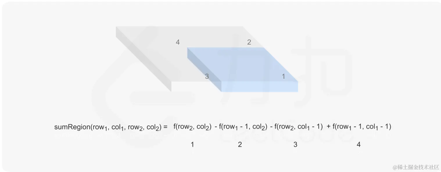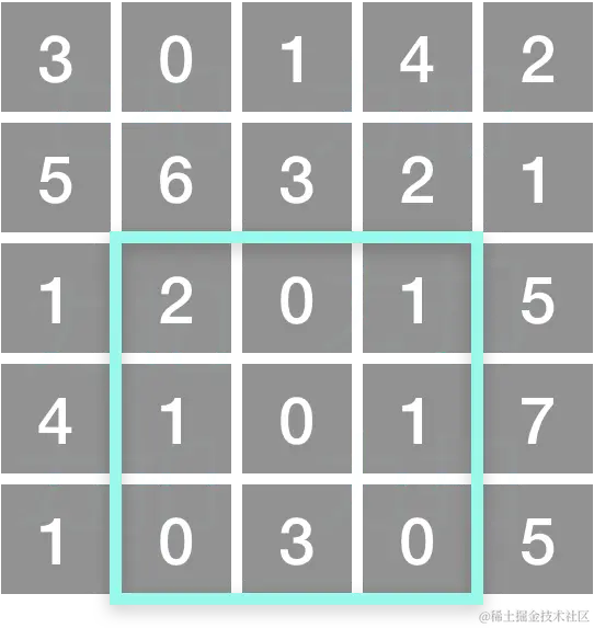 上图子矩阵左上角 (row1, col1) = (2, 1) ,右下角(row2, col2) = (4, 3),该子矩形内元素的总和为 8。