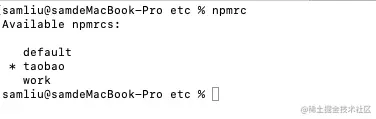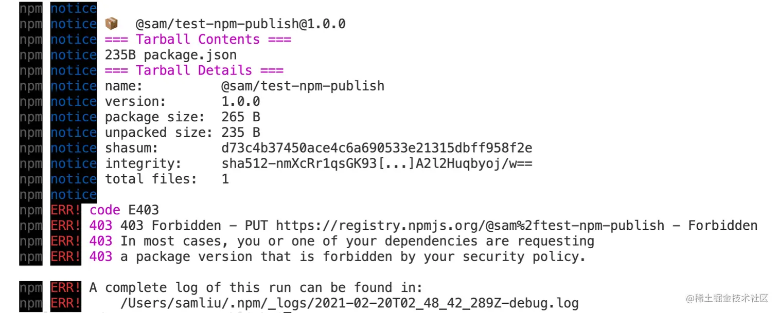 真正的原因是你包的scope名(sam)跟你当前登陆的账号的name(littlepoolshark)不一致(可以参详一下这个stackoverflow问题)。我们可以通过以下的命令快速地查看一下自己当前账号的name是什么: