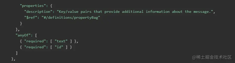 - 第41-44行,定义了这个对象的扩展属性通过key,value的方式定义,具体的定义参考定义组节点definitions下的propertyBag的定义;