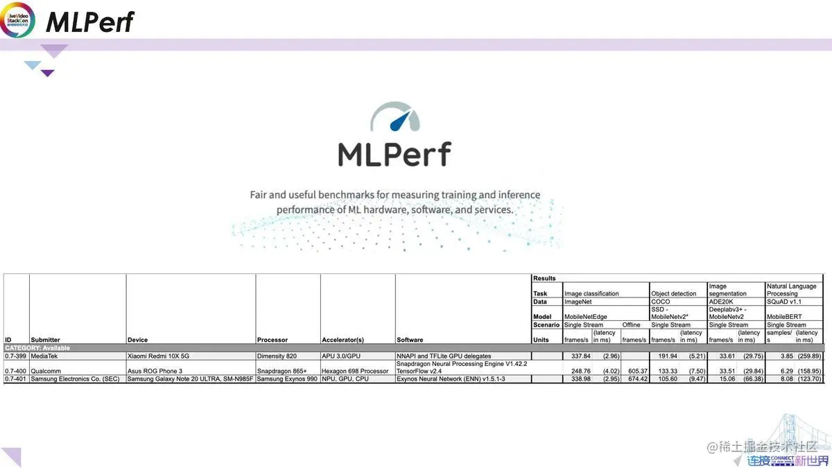 此外,我想向大家介绍机器学习性能基准测试平台MLPerf。这是一个开放的平台供研究人员发布智能模型在不同硬件平台上的最新性能基准,包括准确性、延迟、内存占用和功耗。