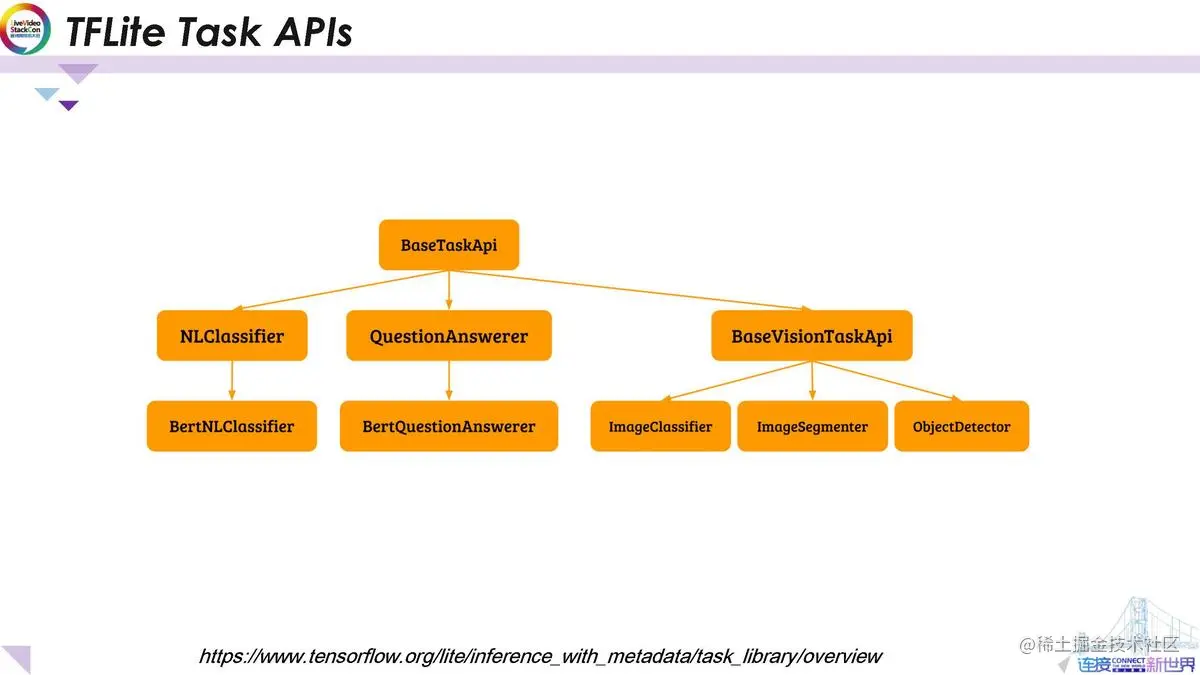 除了稳定的框架和先进的学习技术,TFLite还公开了一组功能强大且易于使用的工具库供应用程序开发人员使用TFLite创建ML体验。它为流行的机器学习任务(包括基于Bert NLP引擎的自然语言分类器、问题回答器)以及视觉任务API(包括分类器、检测器和分段器)提供了优化的即用型模型接口。