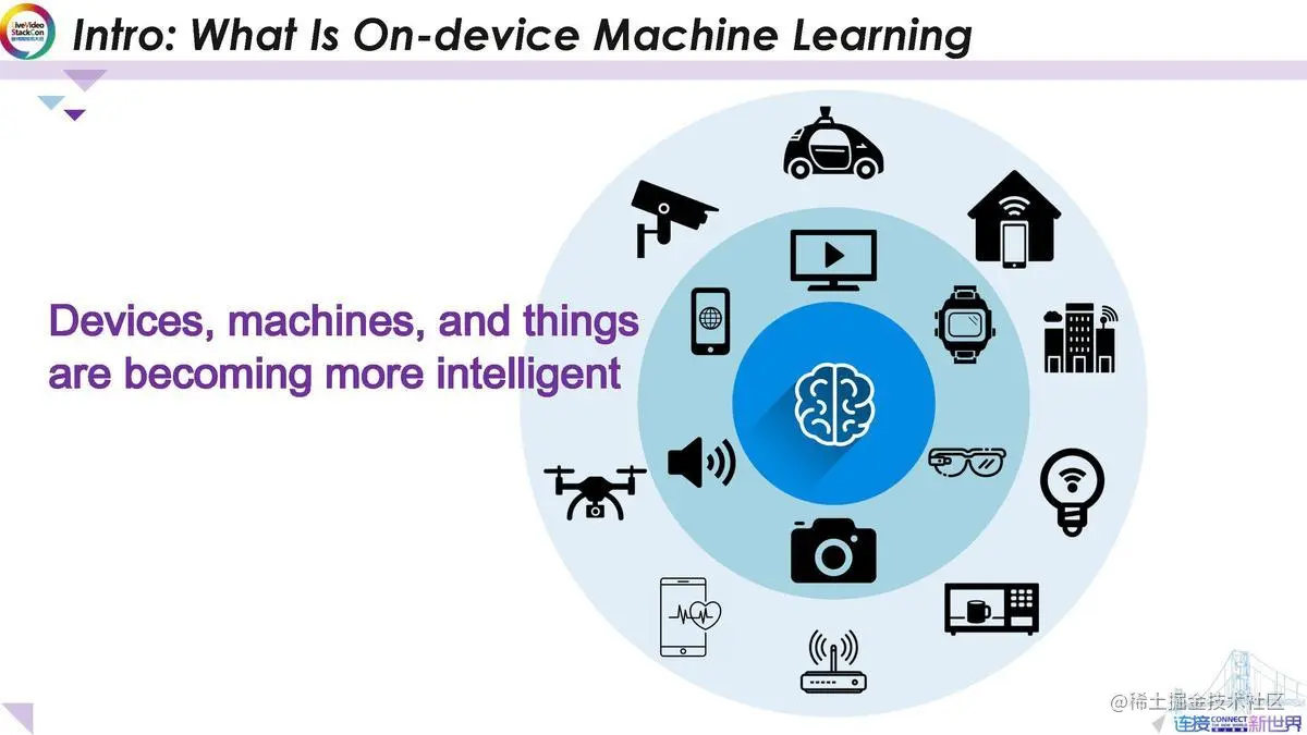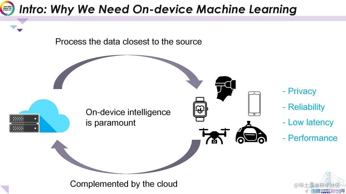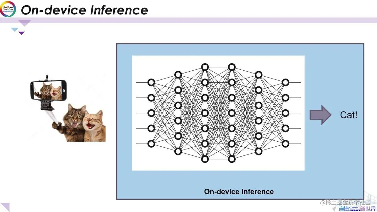 基本上,因此,端上智能是通过使用来自设备传感器(例如摄像头、麦克风、和所有其他传感器)的输入信号在设备上运行深度学习推理来实现。该模型完全在设备上运行而无需与服务器通信。