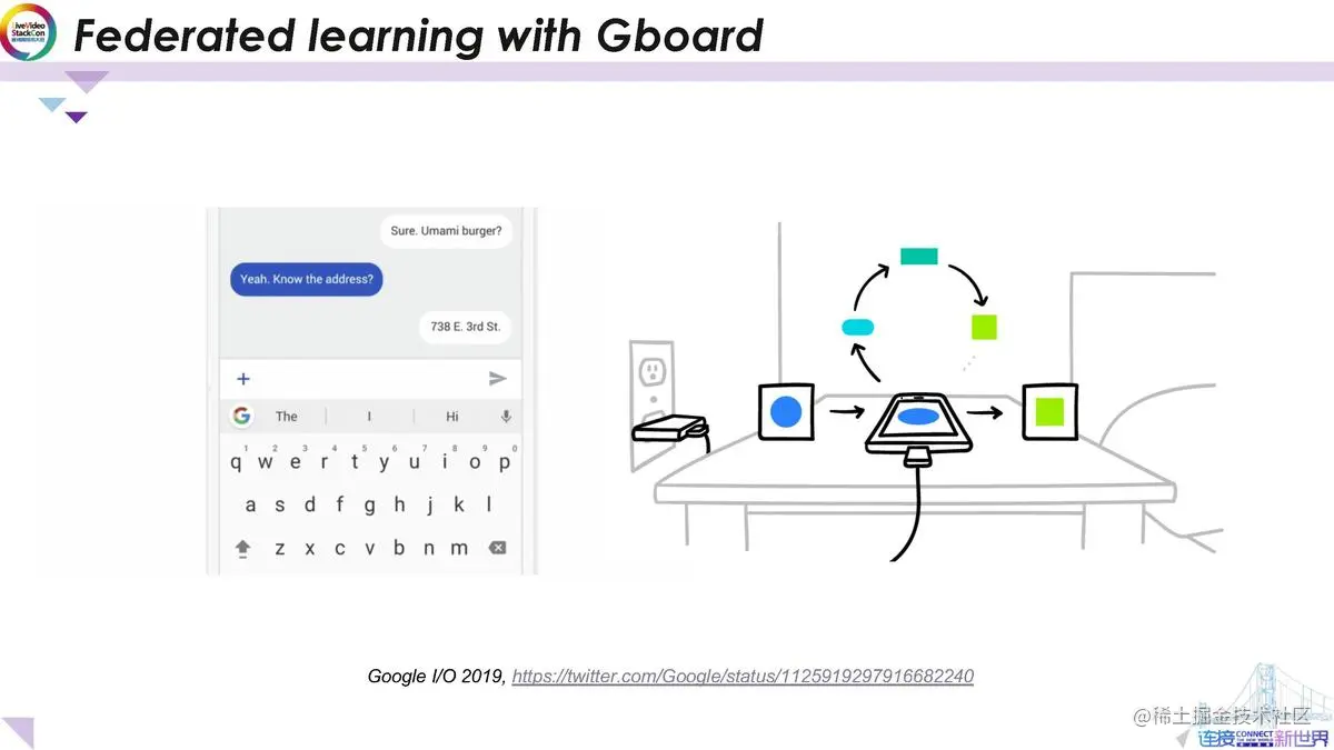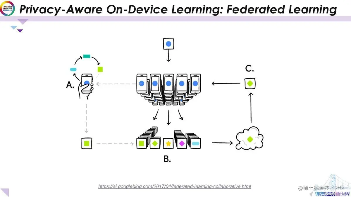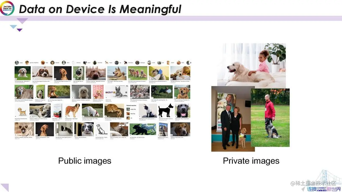 正如我们在开始时提到的,数据隐私是促使我们,转向终端设备机器智能的另一个主要原因。但是,最新的端上机器智能模型的训练仍然需要在服务器端进行。举一个典型的应用案例:为了使机器能够为人类识别狗之类的动物,我们可以使用左侧的公共训练图像来训练模型,但是 我们通常需要在如右侧图片所示的极具挑战性的场景下使用该模型。那么在具有挑战性的日常个性化使用案例中如何使模型达到高精度?一种简单的解决方案是,收集私有图像并通过集中数据中心来重新训练模型。虽然像Google这样的大公司已经建立了最安全、最强大的云基础架构来处理这些数据,以提供更好的服务。但这显然仍然不是最佳的解决方案。因为它引起了使用用户私人数据的问题,其中可能包含敏感信息,例如用户人脸、用户居住空间等。我们如何改善模型的个性化性能并保护用户的隐私。