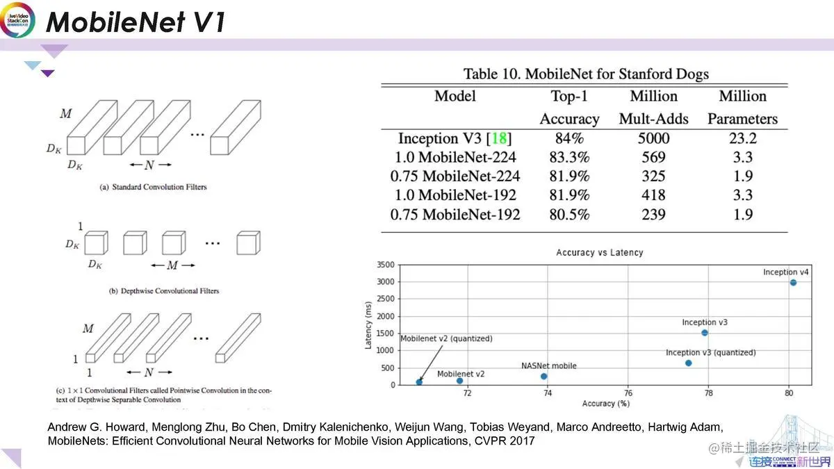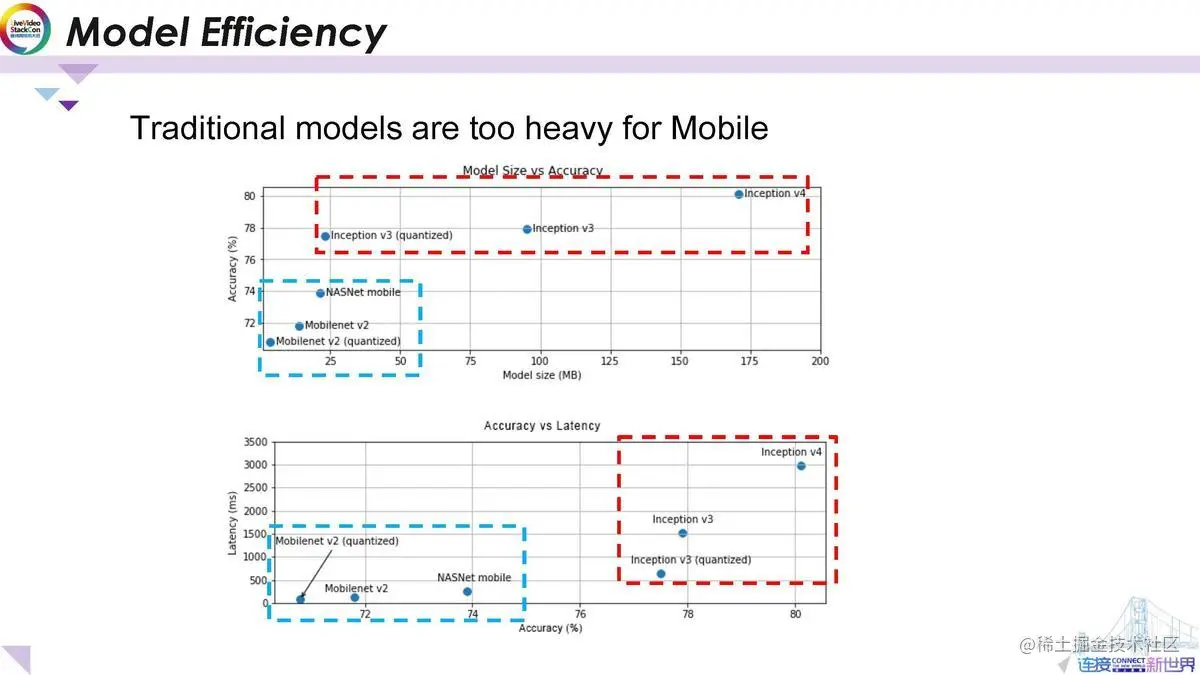 在深入探讨开发移动端智能模型的细节之前,我们先了解一下传统服务器端智能模型和移动端智能模型的性能数据。上图显示了模型大小和准确性之间的数据;而下图显示了模型准确性和延迟之间的数据。其中红色虚线框显示了传统智能模型的性能数据,蓝色虚线框显示的移动端智能模型。从图中可以看出就模型大小和推理延迟而言 Google Inceptiom等传统服务器端智能模型比MobileNet模型要繁重得多。因此,传统模型过于繁重,无法应用于移动应用。