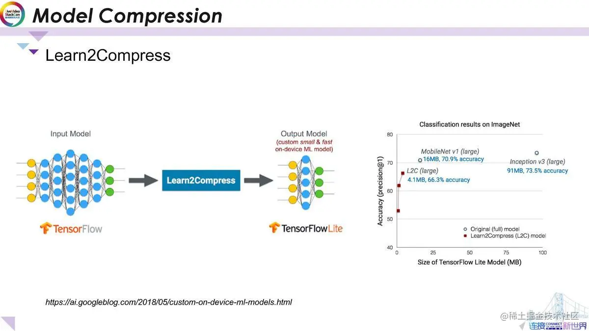 最近TFLite还发布了一个综合库用于将传统的大型模型压缩为较小的模型供给终端设备情形,这被称为Learn2Compress。这项技术采用用户提供的预先训练的大型TensorFlow模型作为输入进行训练和优化 并自动生成尺寸更小、内存效率更高、能源效率更高、推理速度更快、准确性损失最小即用型端上智能模型。具体来说,模型压缩是通过删除对预测最无用的权重或操作(如低分数权重)实现。
