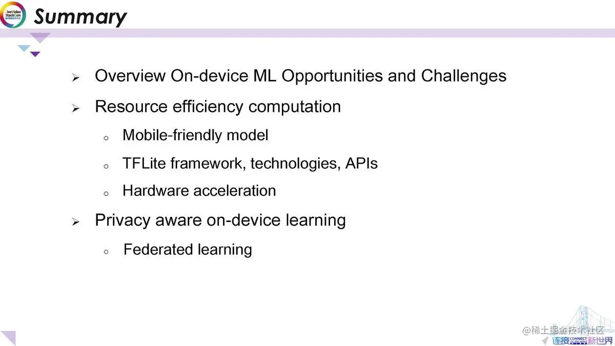 在本次报告中,我们简要概述了端上机器学习的机遇和挑战。其次 我们讨论关于终端设备机器学习的资源效率计算。在这一部分中,我们介绍了移动模型体系结构TFLite框架用于压缩模型的高级技术,以及用于用户构建端上机器智能应用的开源机器学习任务API。最后,我们介绍了隐私保护的端上机器学习技术(联邦学习)的最新进展。我们还指出了端上人工智能的未来发展方向。