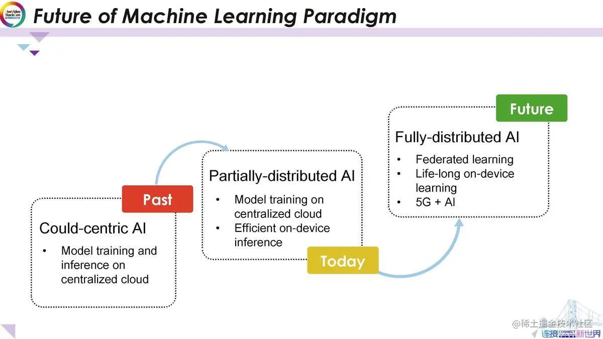在不久的将来,借助联邦学习技术我们将拥有完全分布式的AI以解决隐私问题和终身终端设备学习的支持。最近,5G正在全球范围内部署,5G的低延迟和高容量还将使AI处理能够在设备、边缘云和中央云之间分布从而为各种新的和增强的体验提供灵活的混合系统解决方案。