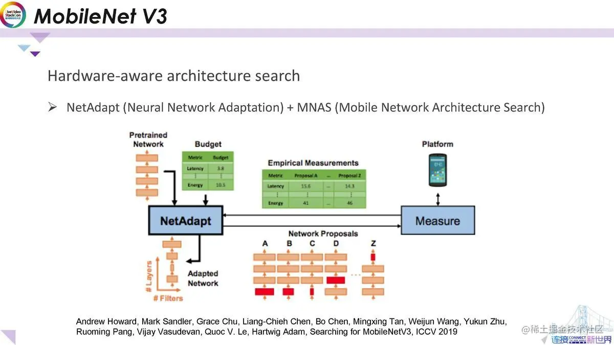2019年研究人员设计了一个全新的MobileNet V3平台。它通过硬件性能关联的模型结构搜索来构建新的MobileNetMobilenet模型。新平台通过将网络适应性和移动网络结构搜索融合在一起,并设置了具有目标延迟、 内存和功耗的目标函数来构建智能模型。