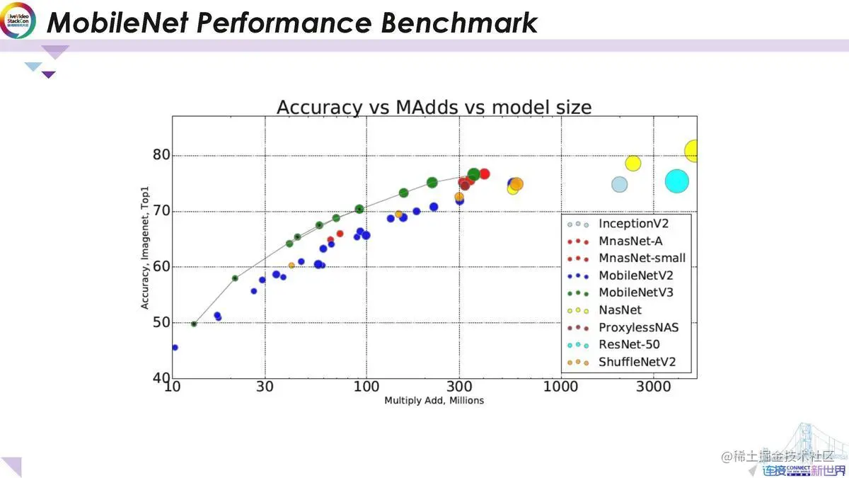 如图所示,研究人员正在通过MobileNetmobilenetvV3和有效的神经体系结构搜索提升端上机器学习模型的性能。这些端上智能模型都达到了与最新服务器端智能模型相似的性能。但保持了较低的计算复杂度。更具体地说MobileNet V3以最低的计算复杂度限制实现了最高的准确性。这有些类似MobileNetmobilenet的体系结构已成为应用端上智能模型的参考和基准。
