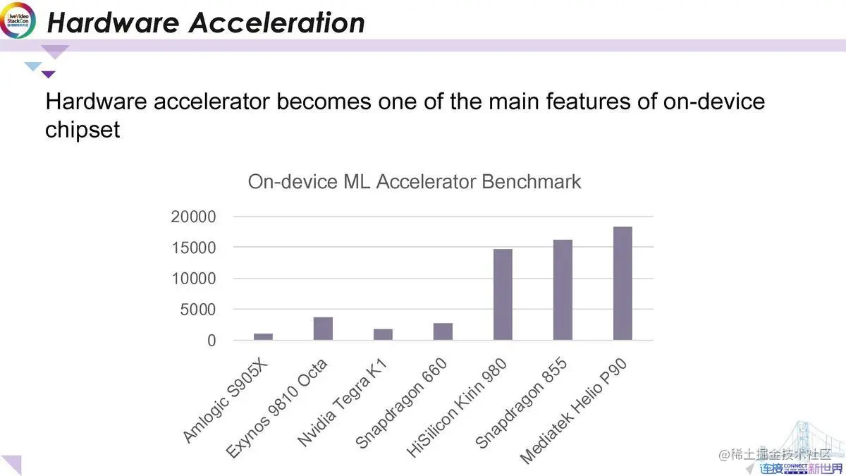 端上机器学习社区当前正在研究的一项主要工作,通过诸如GPU EdgeTPU 和DSP之类的等硬件加速器来加速ML机器学习推理。上图显示了一些最近为移动设备开发的硬件加速器。从图中可以发现最新的芯片组(如海思、麒麟980、骁龙855和MediaTtek P9)的性能显著提高。这个令人振奋的消息将鼓励开发人员在终端设备上开发更多的应用程序。