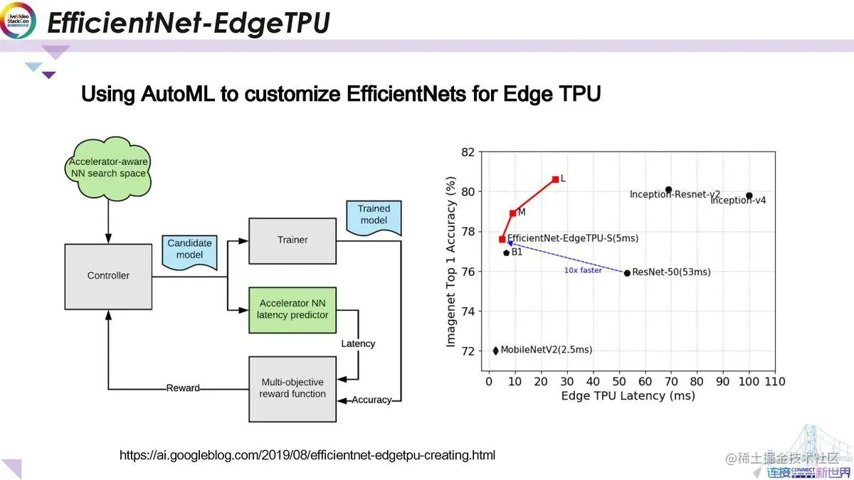 在这里,我们要展示一个利用自动机器学习构建硬件加速的端上机器学习模型的示例。我们将EfficientNet(也是最先进的移动神经网络体系结构之一)作为这项工作的基础。为了构建旨在利用Edge TPU的加速器体系结构的 EfficientNets,我们调用了自动网络结构搜索框架 ,并使用可以在Edge上高效执行的构建块来扩展原始的EfficientNet的神经网络体系结构搜索空间。我们还构建并集成了一个“延迟预测器”模块,该模块通过在周期精确的模型结构结构模拟器上运行模型来提供在Edge TPU上执行时模型延迟的估计。自动网络结构搜索控制器通过强化学习算法以在尝试通过搜索实现最大化预测延迟和模型准确性的联合奖励函数。