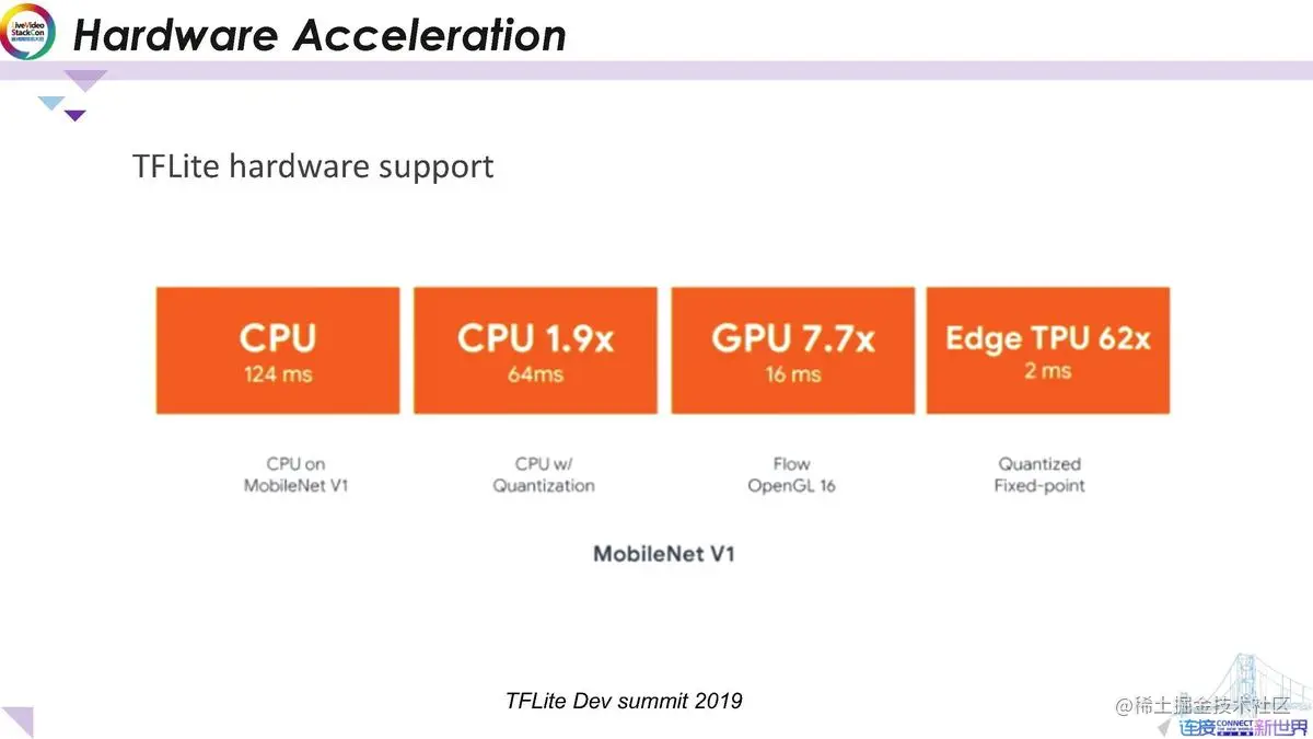 作为广泛采用的终端设备推理平台,TFLite还支持原生硬件加速。在这里,我们显示在CPU, GPU 和边缘TPU上运行MobileNet V1TFLite模型的示例。