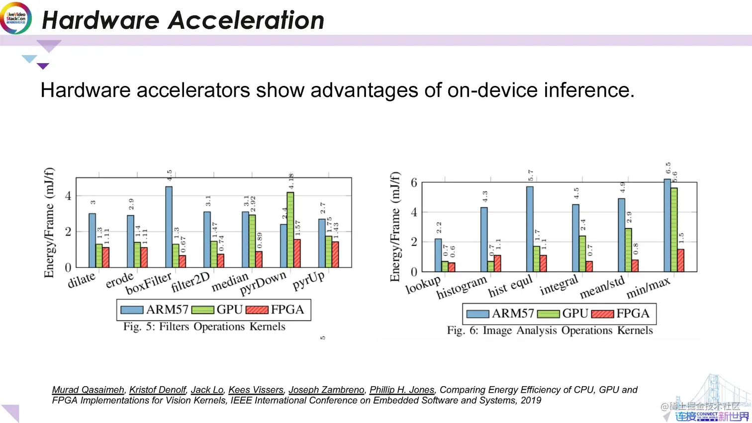 这张幻灯片中的图显示了在ARM GPU和FPGA上运行基本滤波操作和图像分析操作的功耗基准与在CPU上运行相比通过在GPU和FPGA上进行优化来降低能源成本具有显著优势。