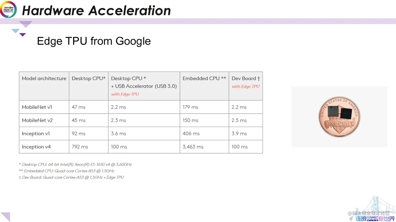 此外 在嵌入式CPU(如四核Cortex A53 )上运行MobileNet V1和V2将超过150毫秒,而在EdgeTPU上使用不到2.5毫秒。