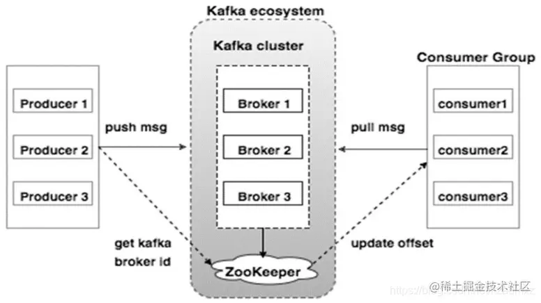 如上图所示,一个典型的Kafka集群中包含若干Producer(可以是web前端产生的Page View,或者是服务器日志,系统CPU、 emory等),若干broker(Kafka支持水平扩展,一般broker数量越多,集群吞吐率越高),若干Consumer Group,以及一个 Zookeeper集群。Kafka通过Zookeeper管理集群配置,选举leader,以及在Consumer Group发生变化时进行rebalance。Producer使用push模式将消息发布到broker,Consumer使用pull模式从broker订阅并消费消息。