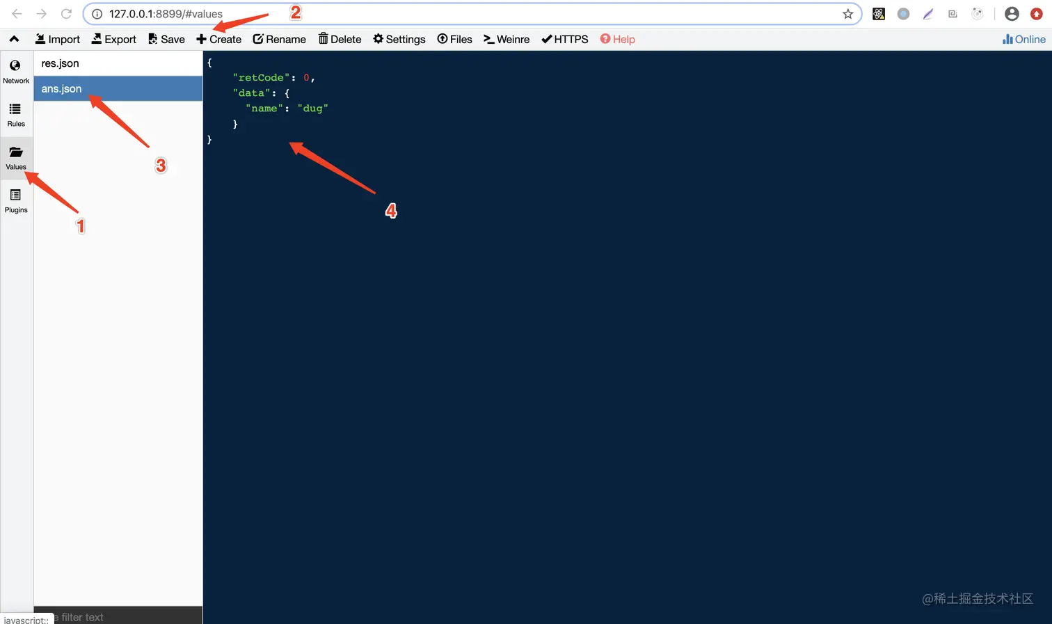 如果不想用本地文件,也可以直接用 whistle 提供的在线文本功能。在 whislte 的配置界面中: