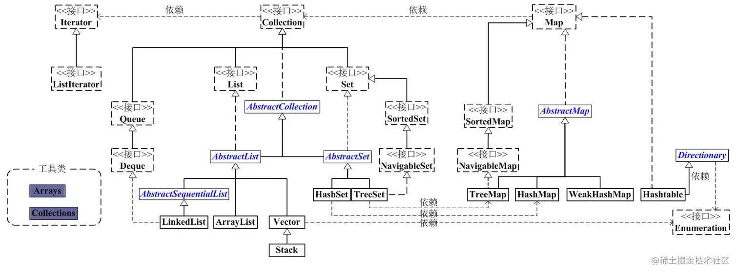 - 遍历集合的工具,即我们通常通过Iterator迭代器来遍历集合。我们说Collection依赖于Iterator,是因为Collection的实现类都要实现iterator()函数,返回一个Iterator对象。
