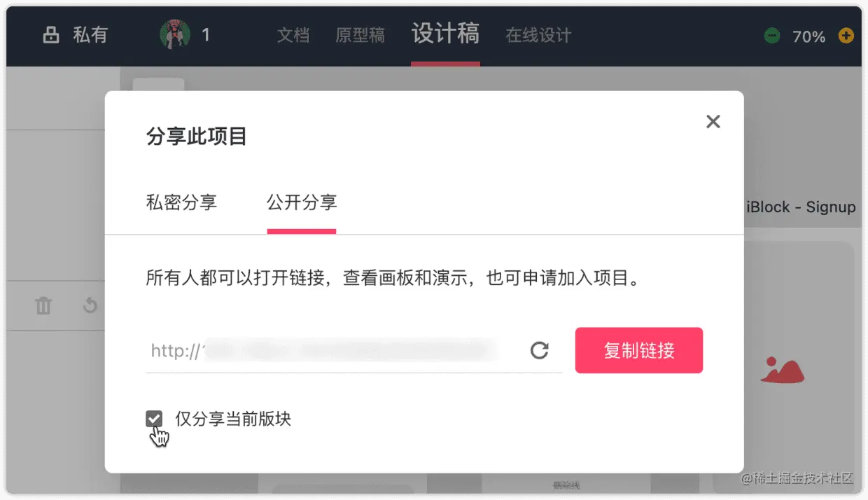 在项目内,你可以单独分享“原型稿”、“设计稿”、“在线设计”任意一个版块,被分享的用户看到的界面就只有一个分类。这个可以用于只给客户展示全貌画板的场景来使用。如果不勾选。默认会将所有模块分享出去哦。