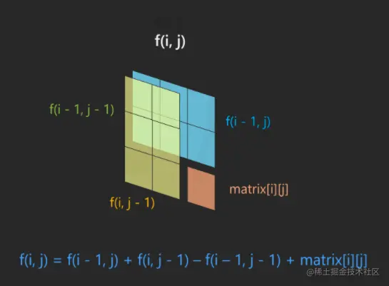 但是通过一维数组前缀和的方法,在求和的时候依然要遍历矩阵高度 m 次。既然一维数组可以直接存前缀和,那到二维矩阵的情况,有没有可能在矩阵的每个位置上存下来任意右下角位置的矩阵的前缀和呢?
