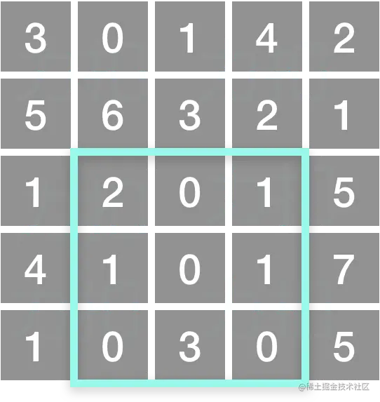 上图子矩阵左上角 (row1, col1) = (2, 1) ,右下角(row2, col2) = (4, 3),该子矩形内元素的总和为 8。