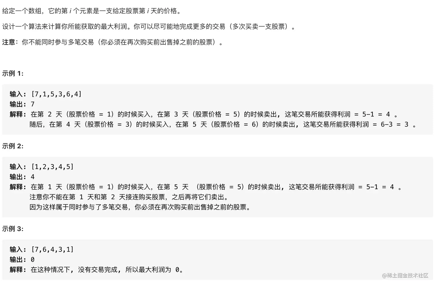 思路二:从评论学习到的,不限制交易次数,只要收集到所有的上坡合集,一定是利益最大化的。今天比昨天涨了,卖出;今天比昨天跌了,不卖,拆成了一节一节的利润,合并到一起。