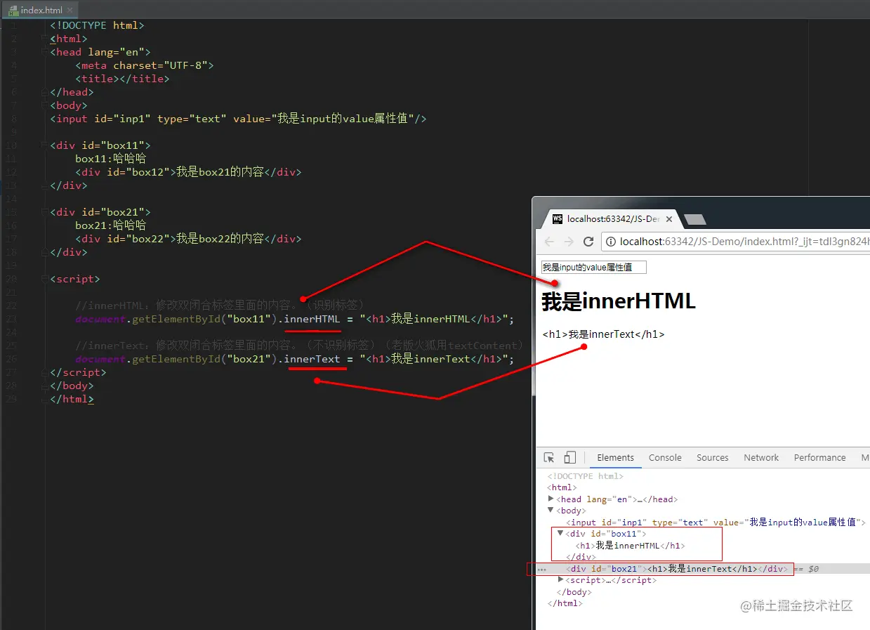 修改内容举例:(innerHTML会修改标签本身,而innerText则不会)