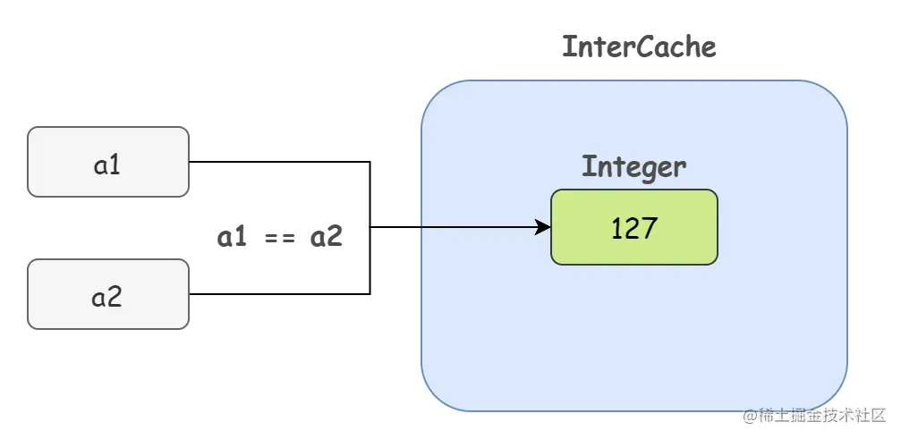 从 a1 开始看,由于其值在 InterCache 的缓存区间内,所以这个 Integer 对象会被存入缓存。而在创建 a2 的时候,由于其值和 a1 相等,所以直接从缓存中取出值为 127 的 Integer 对象给 a2 使用,也就是说,a1 和 a2 这两个 Integer 的对象引用都指向同一个地址。