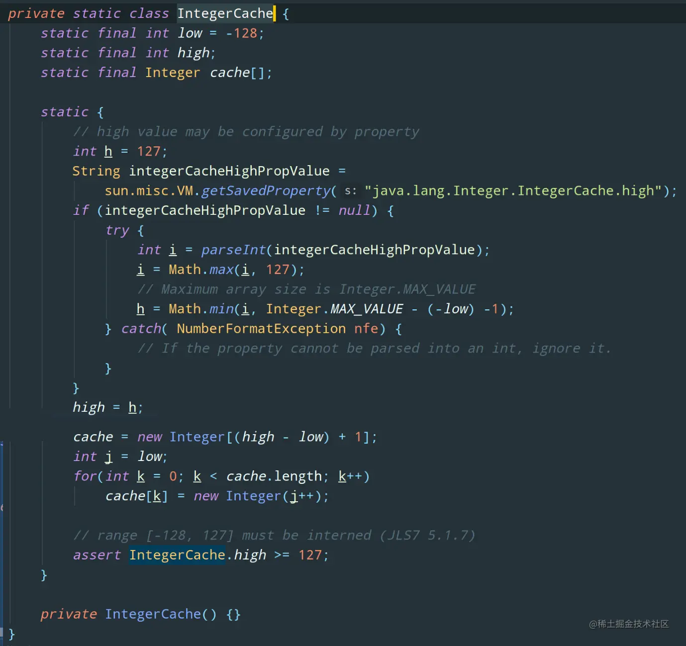 IntegerCache 是 Integer 类中的静态内部类,综合这两段代码,我们大概也能知道,IntegerCache 其实就是个缓存,其中定义了一个缓冲区 cache,用于存储 Integer 类型的数据,缓存区间是 [-128, 127]。