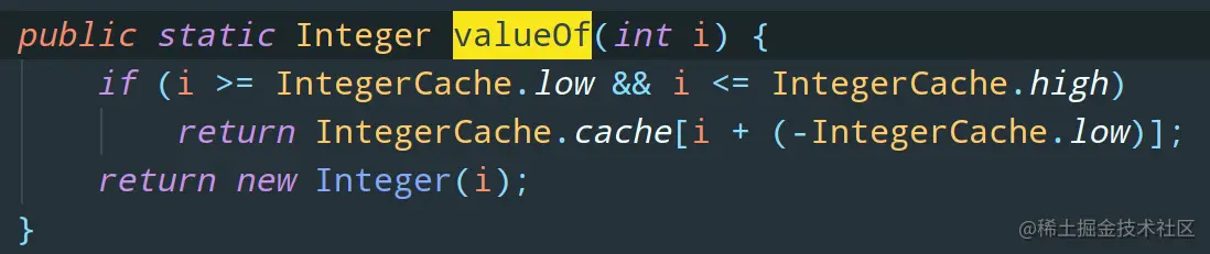 回到 valueOf 的源码:它首先会判断 int 类型的实参 i 是否在可缓存区间内,如果在,就直接从缓存 IntegerCache 中获取对应的 Integer 对象;如果不在缓存区间内,则会 new 一个新的 Integer 对象。