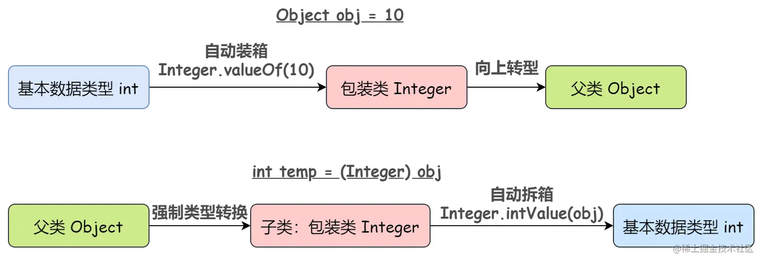 Integer obj = 10; // 自动装箱. 基本数据类型 int -> 包装类 Integer