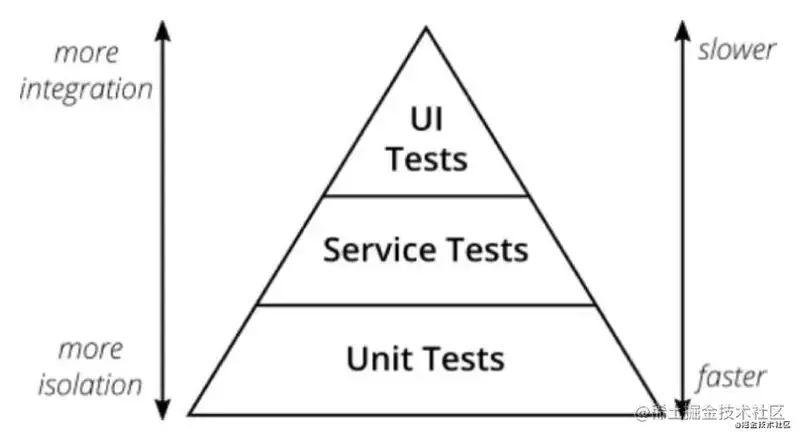 测试过程中会涉及不同的需求,以Mike Cohn在他的著作《Succeeding with Agile》一书中提出的“测试金字塔”宝图镇楼为例, 从下至上对应的测试需求分别为:单元测试,服务测试,用户界面测试。