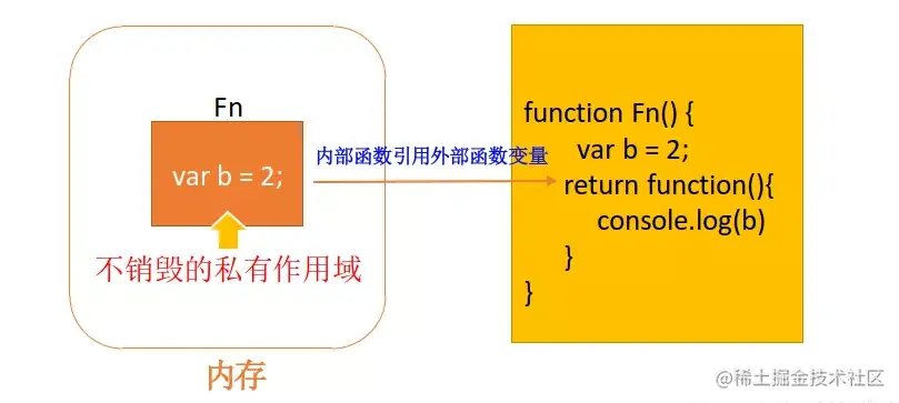 内部函数引用着外部的函数的变量,外部的函数尽管执行完毕,作用域也不会销毁。从而形成了一种不销毁的私有作用域。