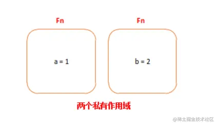 声明两个函数,分别创建量两个私有的作用域(可以理解为两个封闭容器),fn2 是不能直接访问私有作用域 fn1 的变量 a 的。同样的,在 fn1 中不能访问到 fn2 中的 b 变量的。一个函数就是一个作用域。
