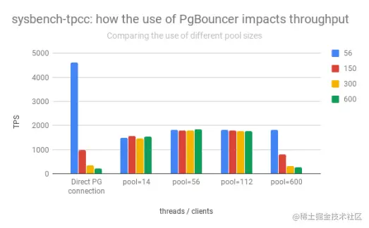 在只有56个并发客户端的情况下运行sysbench-tpcc时,使用到PostgreSQL的直接连接可以提供比使用PgBouncer时高2.5倍的吞吐量(TPS表示每秒事务)。在这种情况下,使用连接池会极大地影响性能。在如此小的规模下,连接池没有任何收益,只有开销。