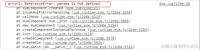 在执行try里面的代码时,因为params并未定义,所以会出错,这时候错误信息就会在catch里面出现:
