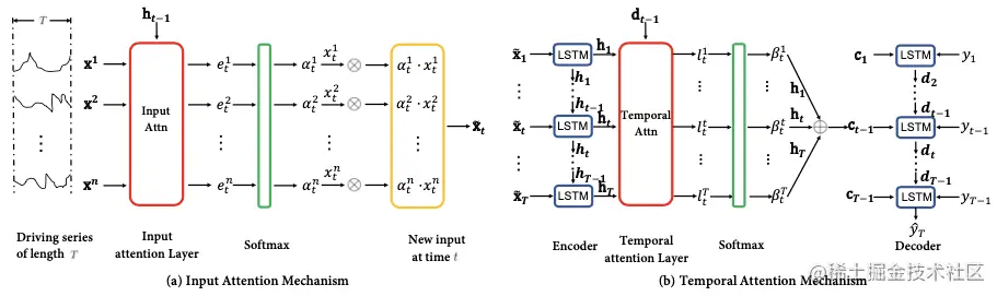 1. 两个attentionn机制,input attn是使用非线性变化直接求权重,temporal attn是传统的seq2seq结构的attention机制