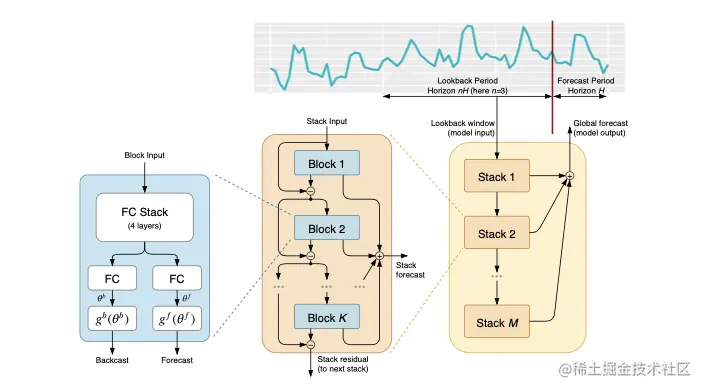一种是可解释部分,主要把FC学好的向量用trend和seasoanlity的形式来表示,然后分别有backcast和forecast去训练,使模型学习到trend和seasonality的信息