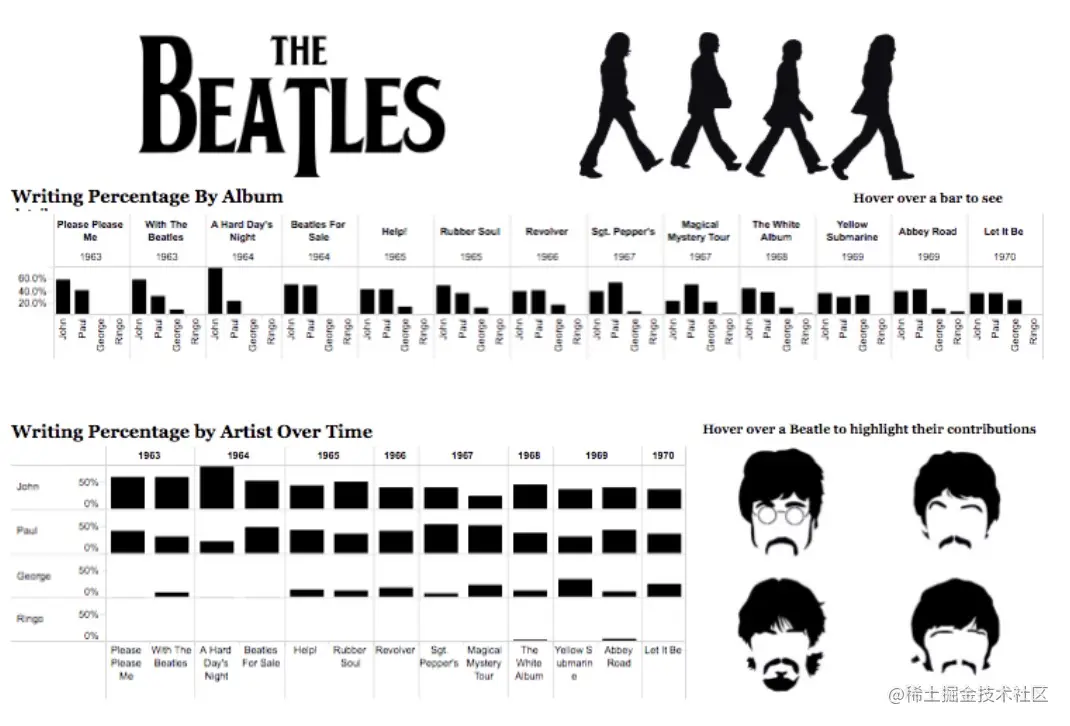 使用文本时,也要确保它能够指出了重要的数据细节,例如上图案例中甲壳虫乐队成员对在流行程度最高时发行的签名歌曲和专辑的个人贡献进行了数据可视化,并使用了大量的文本作为元素。