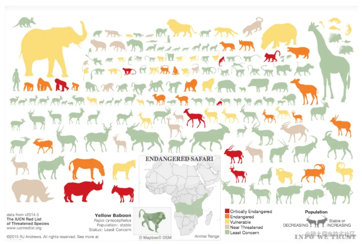 例如,以上关于非洲濒危物种的图表一目了然,告诉我们什么动物濒临灭绝以及它们有多脆弱。与其使用带有值的条形图,不如将每个动物使用剪影的图案形式可以使其变得更加有趣和直观。