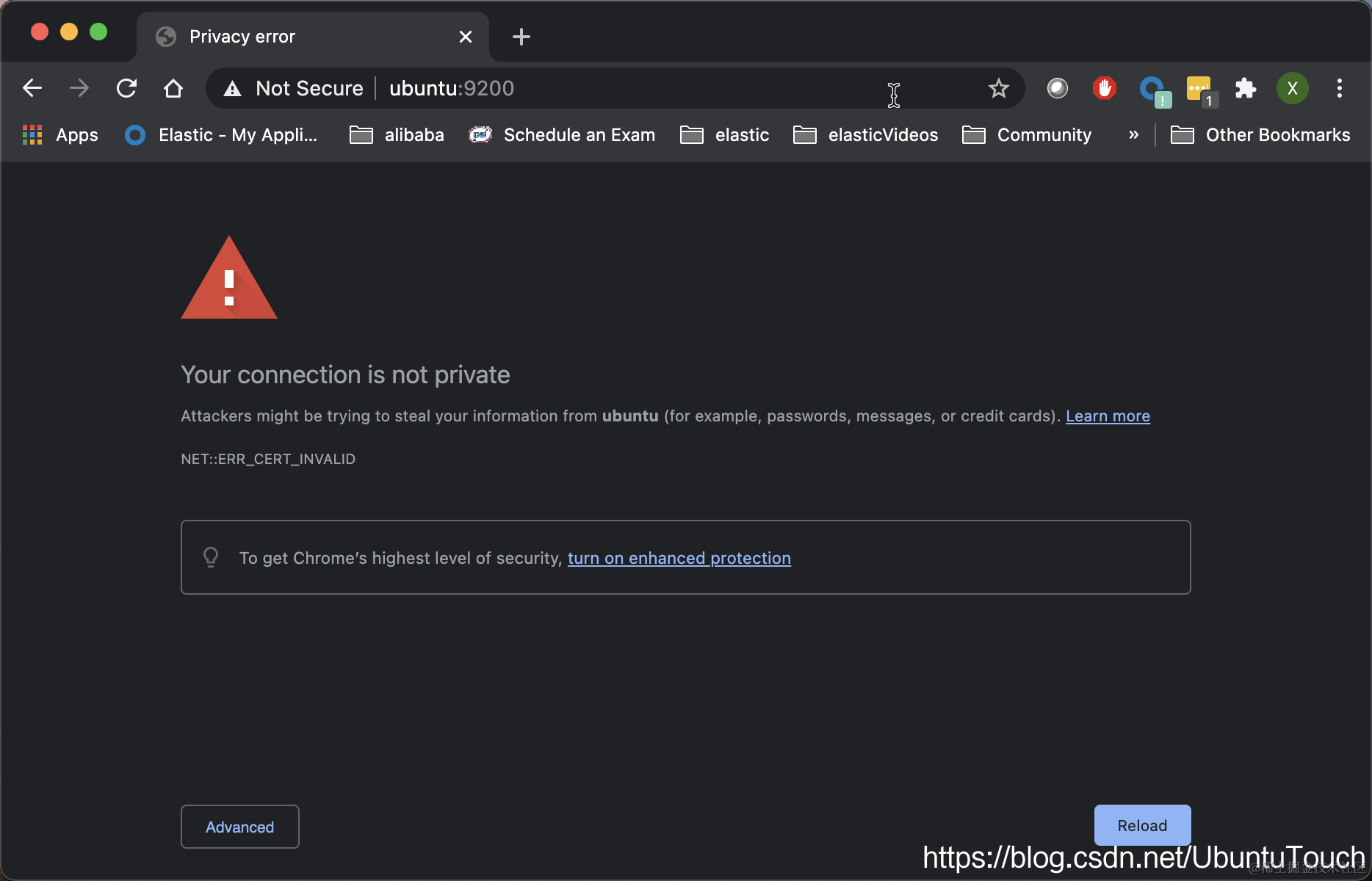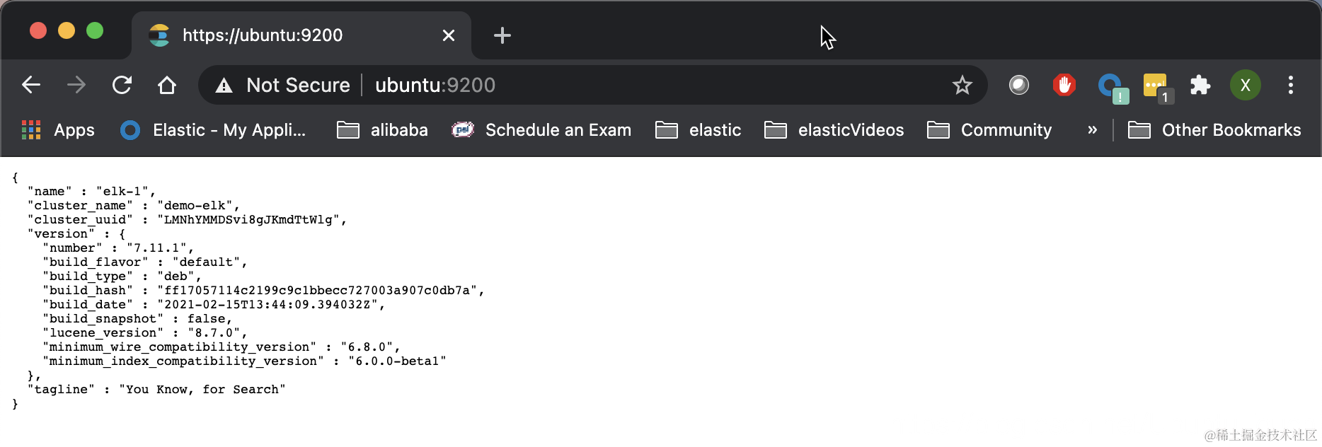 我们可以通过另外一个机器来访问 ubuntu 机器 https://ubuntu.9200。当 Chrome 浏览器上出现如下的画面时: