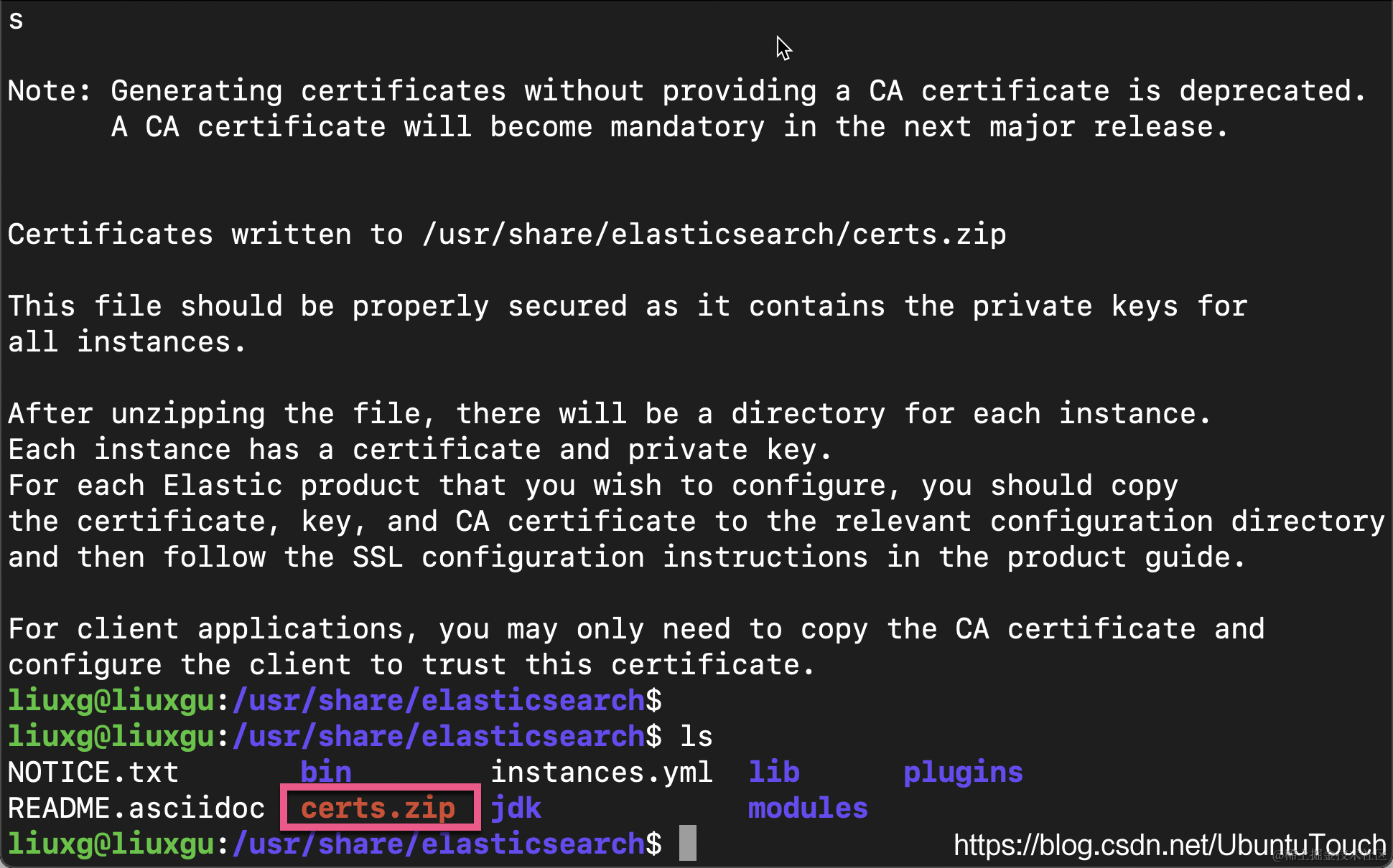 /usr/share/elasticsearch/bin/elasticsearch-certutil cert ca --pem --in instances.yml --out certs.zip